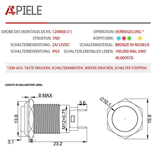 Dimensione del foro di fissaggio: 12 mm. Capacità di commutazione: 12 V