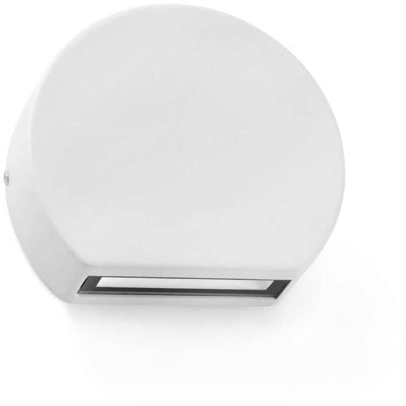 Aplique para exterior blanco mate, modelo PILL de FARO. Se puede fijar en pared. La fuente de luz incluida es COB LED 3,5W 3000K 110Lm. Fabricado en aluminio y acabado en blanco mate. Dispone de una protección IP54