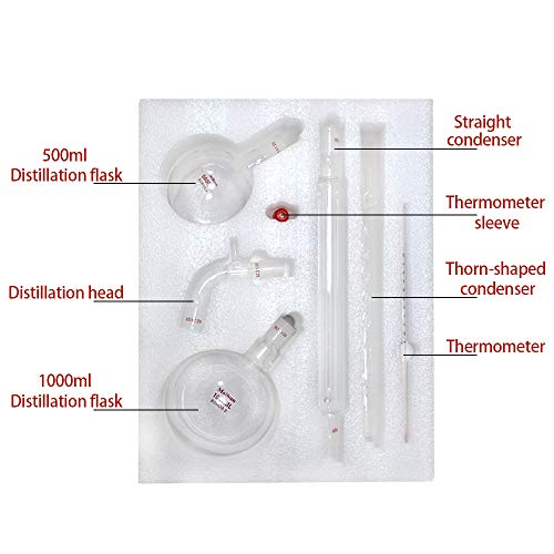 Apparecchio per distillazione del vetro Distillazione di oli essenziali con doppio condensatore Flaconi da 1000 ml e 500 ml Adattatori per distillazione Kit di vetreria per chimica da laboratorio