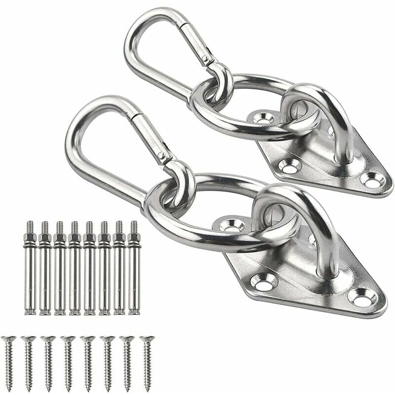 Il kit per appendere l'amaca viene fornito con moschettone M8 e piastra con occhiello M8 con O-ring (L×P: 80×50 mm/Diametro: 8 mm), viti in acciaio inossidabile e tassello a muro adatto per gancio per amaca. La punta di cui avrai bisogno è 8 mm. I ganci per amaca possono essere fissati a edifici in legno, pareti di mattoni, legno, ecc. per l'amaca da interno/giardino e i fissaggi forniti, fissare la piastra passacavo al muro di mattoni, indipendentemente dal soffitto verticale o orizzontale per le altalene. Il nostro kit di ganci per appendere l'amaca è realizzato in acciaio inossidabile 304. E ora abbiamo anche aggiornato le viti in acciaio inossidabile 304, adatte per il montaggio su pareti solide, soffitti, pavimenti, patii, alberi, ecc. I nostri ganci per amaca possono fornire un supporto più forte per il progetto sospeso. 800 libbre se fissato correttamente (400 libbre per occhiello), rendendolo un'aggiunta perfetta per la camera dei bambini o la stanza dei giochi. Goditi un