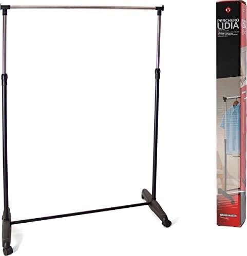 Appendiabiti da terra estensibile, con 4 ruote per un facile trasporto. Regolabile in altezza. Misure: altezza 90,5/160 cm. Larghezza 81 cm. Profondità 42 cm.