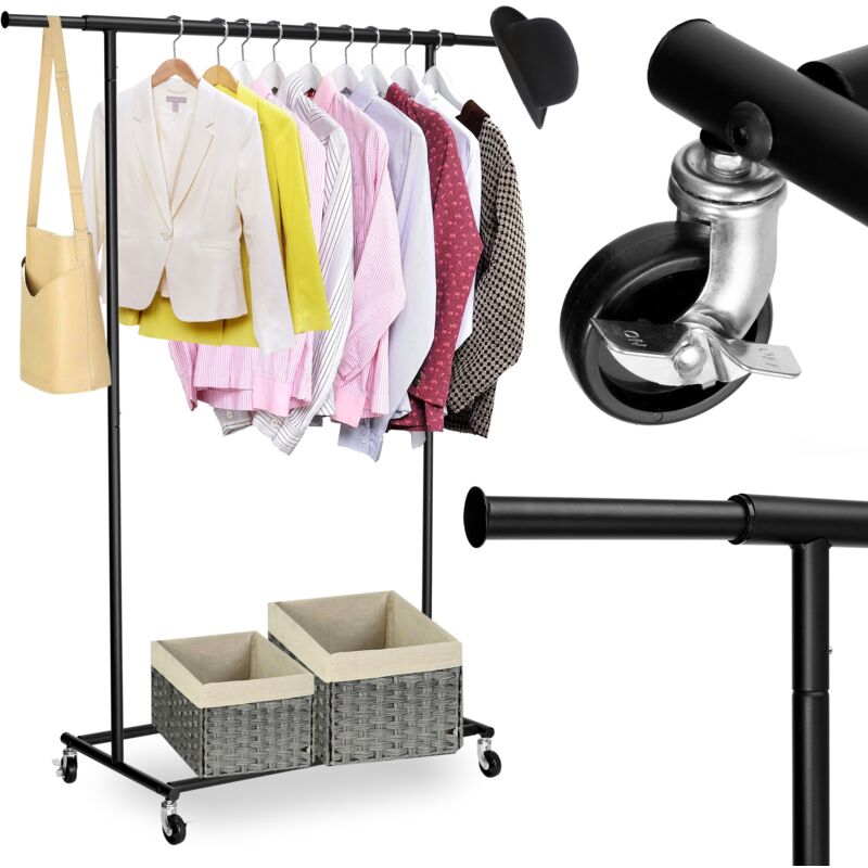 Appendiabiti da terra Tahir nero su ruote Destinazione d'uso: espositore per abiti | Colore: nero L'appendiabiti Tahir è un pratico e durevole appendiabiti da terra su ruote ad alta resistenza, realizzato in acciaio verniciato a polvere nera. Dispone di freni integrati e della possibilità di regolare i bracci laterali fino a circa 20 cm, che consente di espandere la gruccia fino a una larghezza di 132 cm. La gruccia Tahir può sostenere fino a 90 kg di carico uniforme e il livello inferiore può facilmente ospitare scatole di accessori o diverse paia di scarpe. L'appendiabiti Tahir è la soluzione ideale per le persone che apprezzano l'aspetto elegante della propria casa o ufficio, nonché la praticità e la funzionalità. È molto mobile e facile da spostare, quindi può essere adattato liberamente alle mutevoli esigenze. La struttura semplice e il design classico dell'appendiabiti Tahir gli permettono di adattarsi facilmente a qualsiasi interno. VANTAGGI Solida struttura in acciaio