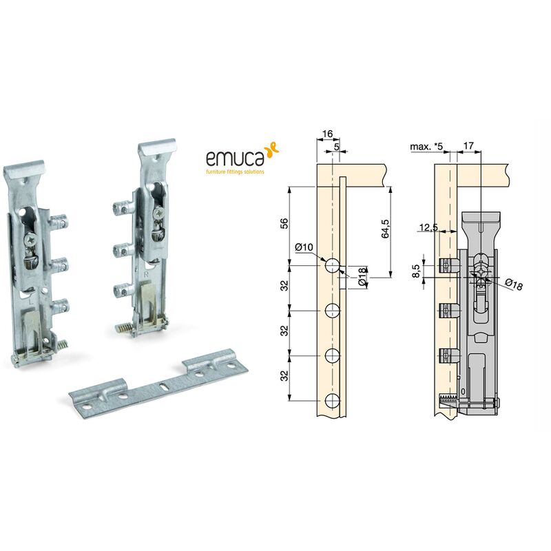 Set di Appendipensili, marca Emuca Caratteristiche Tecniche: -Per moduli da 600mm a 1.000mm di altezza e da 300mm a 350mm di profondità. -3 regolazioni: laterale 16mm, in altezza fino a 18 mm e profondità fino a 25mm. -Capacità di carica 65Kg per appendipensili secondo DIN-68840 certificato da LGA. (Equivale ad un peso di 260Kg per coppia in un modulo da 700mm di altezza e 350mm di profondità). -Il fissaggio si realizza nel fianco del mobile indipendentemente dalla copertura superiore. -Per un miglior fissaggio sono inclusi dei codoli metallici reversibili che si fissano al modulo mediante leva di bloccaggio. -Utilizzare cacciavite Philips n°2 Ø6 o Pozidrive n°2 Ø6. Ogni set contiene: -nr.01 appendipensile mano destra. -nr.01 appendipensile mano sinistra. -nr.01 piastrina di fissaggio a muro. La confezione comprende: -nr.02 Appendipensili DX+SX -nr.02 Piastra per aggancio ZingaroWeb è rivenditore di Appendipensili . La nostra conoscenza del catalogo garantisce all'acquirente il
