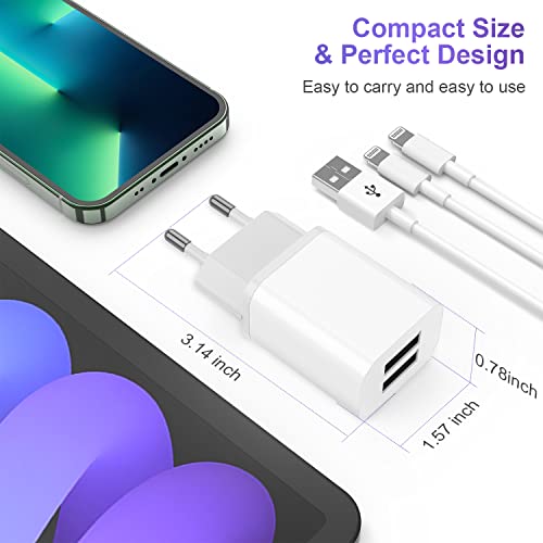 【12W CARICATORE IPHONE + 2 CAVI LIGHTNING】: il caricatore da parete ha 2 porte USB che possono caricare due dispositivi contemporaneamente. Sono inclusi due cavi certificati MFi da 2 metri. Puoi usarli in ufficio, auto, divano, stanza, ecc. Nota: quando 2 dispositivi vengono caricati contemporaneamente, la velocità di ricarica di ciascuna porta è di 6 W.