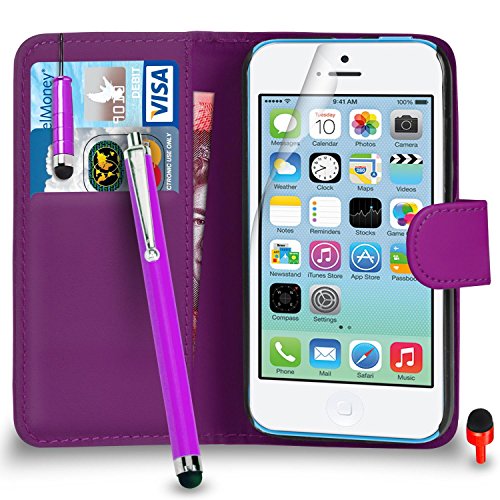 Apple iPhone 5C Premio Pelle VIOLA Portafoglio Capovolgere Caso Copertina Marsupio Con Mini & Big Toccare Stilo Penna ROSSO Polvere Tappo Schermo Protettore & Lucidatura Stoffa SVL3 DI SHUKAN®, (PORTAFOGLIO VIOLA)