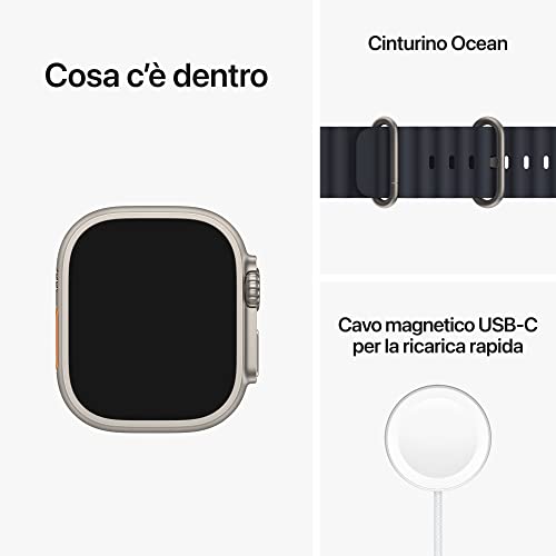 Apple Watch Ultra (GPS + Cellular, Cassa 49mm) Smartwatch con robusta cassa in titanio e Cinturino Ocean color mezzanotte. Fitness tracker, GPS di precisione, batteria a lunghissima durata