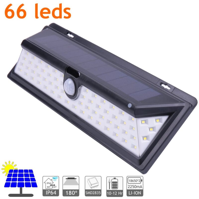 Applica LED solare 66 LED con sensore di movimento APPLICE LED solare con pannello monocristallino, si accende quando rileva e ha due modalità di riposo. illuminazione solare applique Questa applicazione solare ha diverse modalità operative: Off - Off. Modalità 1. Viene disattivato dal giorno e quando non c'è movimento, si trasforma al 100% quando è notte e c'è un movimento. Modalità 2. È disattivato. Di notte è il 25% quando non c'è movimento, gira al 100% quando è notte e c'è un movimento. Modalità 3. Questo giorno e notte è sempre al 25%. Modalità normale, accende quando si rileva il movimento del 100%. illuminazione reale Non è un'applicazione decorativa poiché genera luce in modo da poter vedere dove passa l'area e le luci. Questo modello è dotato di 66 LED SMD2835 alta potenza che crea luce come lampada da 12W, circa 500 lumen pannello mono mono cristallino L'applique solare a LED è dotata di un pannello monocristallino ad alta potenza, ottiene fino al 17% in più di carico in