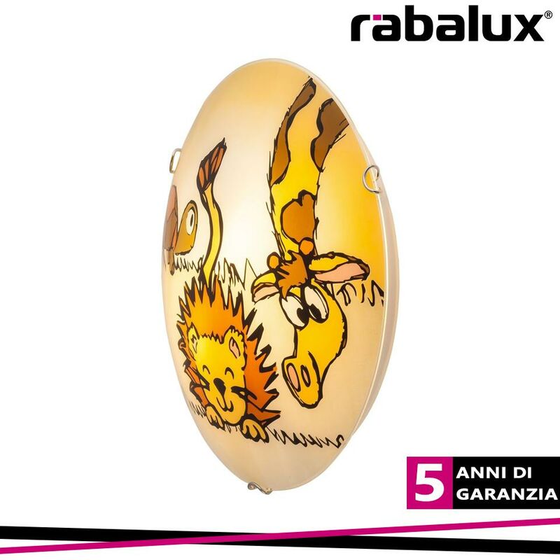 Lampada stanza Leon vetro metallo per bambini colorato Ø40cm Dimensioni in mm: Diametro: 400 peso in kg: lampada inclusa: NO tipo di lampadina / versione: E27 informazioni sulla lampada / potenza massima: E27 2x 40W MAX classe (a ++ a e): a ++ - e di riduzione luminosità: YES protezione: IP20 materiale contenitore: metallo materiale diffusore in vetro: vetro Colore: colorato