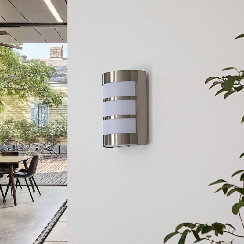 Applique da muro dalla forma curva realizzato in acciaio può essere installato sia in posizione orizzontale che verticale si adatta a qualsiasi superficie. Grado di protezione ip44 è adatto per l installazione in ambienti esterni poiché resiste agli spruzzi d acqua. Dotato di porta lampada con attacco e27 (lampadina non inclusa). Dimensioni: 21x16.5x9 cm Peso: 360gr Colore: Silver Contenuto della confezione: N 1 Applique senza lampadina