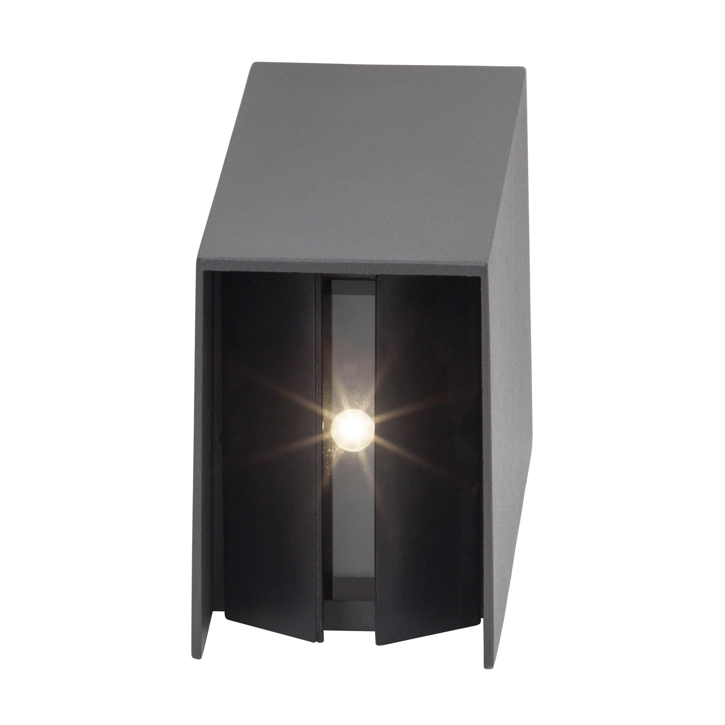 Adapt è un'applique da esterno a due luci, a LED integrato da 6W e da 3000K. E' composta da alluminio e vetro, di colore antracite, ed è dotata di un grado di protezione IP54.. IP54. Orientabile. Luce sia sopra che sotto