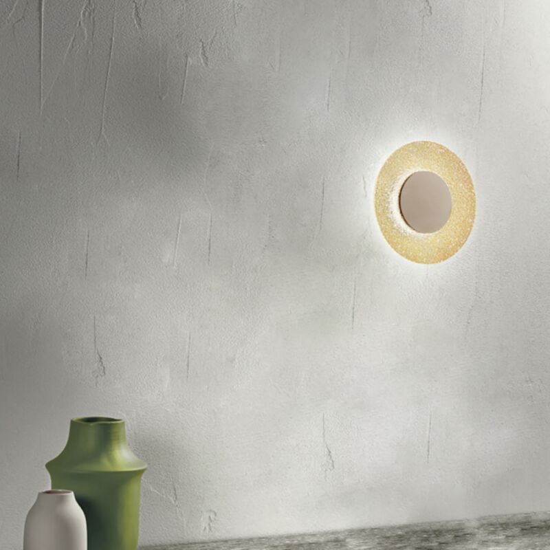 Lampada da parete Led CANDY realizzato in metallo verniciato e vetro graniglia colorato. Montatura in metallo verniciato oro. Grazie alla particolare lavorazione del vetro questo lampadario arreda con un tocco di colore e vivacita' qualsiasi ambiente della casa, ma anche spazi aperti al pubblico come locali e uffici. CARATTERISTICHE Colore: Ambra Materiale: Metallo, vetro Tipologia: Applique Diametro: 25 cm Profondita': 4,5 cm Dimmerabile: No Illuminazione: LED integrato Potenza: 6W 333-550 LM Input: 220-230V Colore luce: 3000K