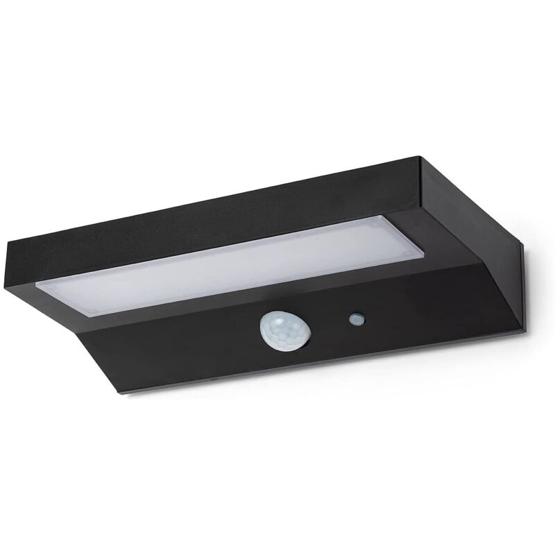 A carica solare con rilevatore di movimento, corpo in plastica, schermo inpolicarbonato opalino.pannello solare monocristallino, batteria litio 3,7v 2200 mah600 lmn, dimensioni cm 20x10x4