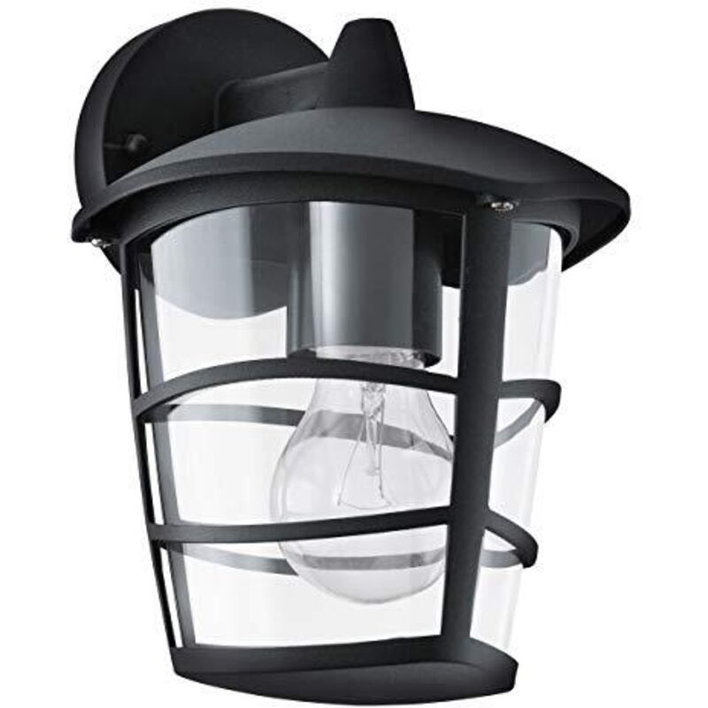 Collezione Aloria IL TUO SPAZIO ESTERNO MODERNO SENZA TEMPO L'applique per esterni ALORIA, dal design moderno che ricorda una lanterna.. È costituita da un corpo nero in fusione di alluminio con vetri chiari in plastica che lasciano vedere direttamente la lampadina. Questa lampada per esterni ha un sistema anti-spruzzo (IP44) che le consente di essere utilizzata senza problemi negli spazi esterni. Lo stile senza tempo completa abilmente l'ambiente esterno. La lampadina a filamento presente nell'immagine non è inclusa nella consegna. Per la lampada è adatta qualsiasi lampadina con attacco E27.