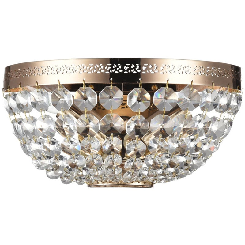 Collezione Ottilia L'ILLUMINAZIONE DAL DESIGN SOFISTICATO Applique contemporanea della seria Ottilia, struttura in metallo colore oro con 2 luci e diffusori in metallo. È un'opera d'arte luminosa dal design elegante e sofisticato, realizzata con cura dei dettagli e finiture di alta qualità, è caratterizzata da un cerchio con ornamento traforato, che ne valorizza la forma e la rende unica nel suo genere. Le luci distribuite su diffusori anch'essi in metallo, che producono una luce intensa e brillante, mentre i diffusori presentano un decoro di cristalli di diverse dimensioni e tagli, che creano splendidi effetti di luce e di riflessione, regalando un'atmosfera raffinata e lussuosa. La forma della plafoniera è quella di una tradizionale coppa antica, rivisitata in chiave moderna grazie all'uso dei materiali e alle soluzioni estetiche adottate. Grazie alla sua forma, la plafoniera si integra perfettamente in contesti arredati in stile classico o moderno, regalando un tocco di eleganza e