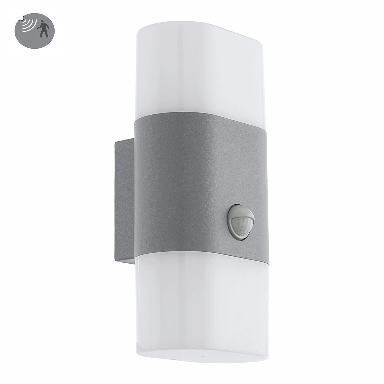 FAVRIA 1 Parete 2x6W LED 3000K 1200Lm Struttura / diffusore alluminio verniciato grigio e policarbonato bianco.IP44 Sensore di presenzaDimensioni: 12,5 x 11,5 x H26