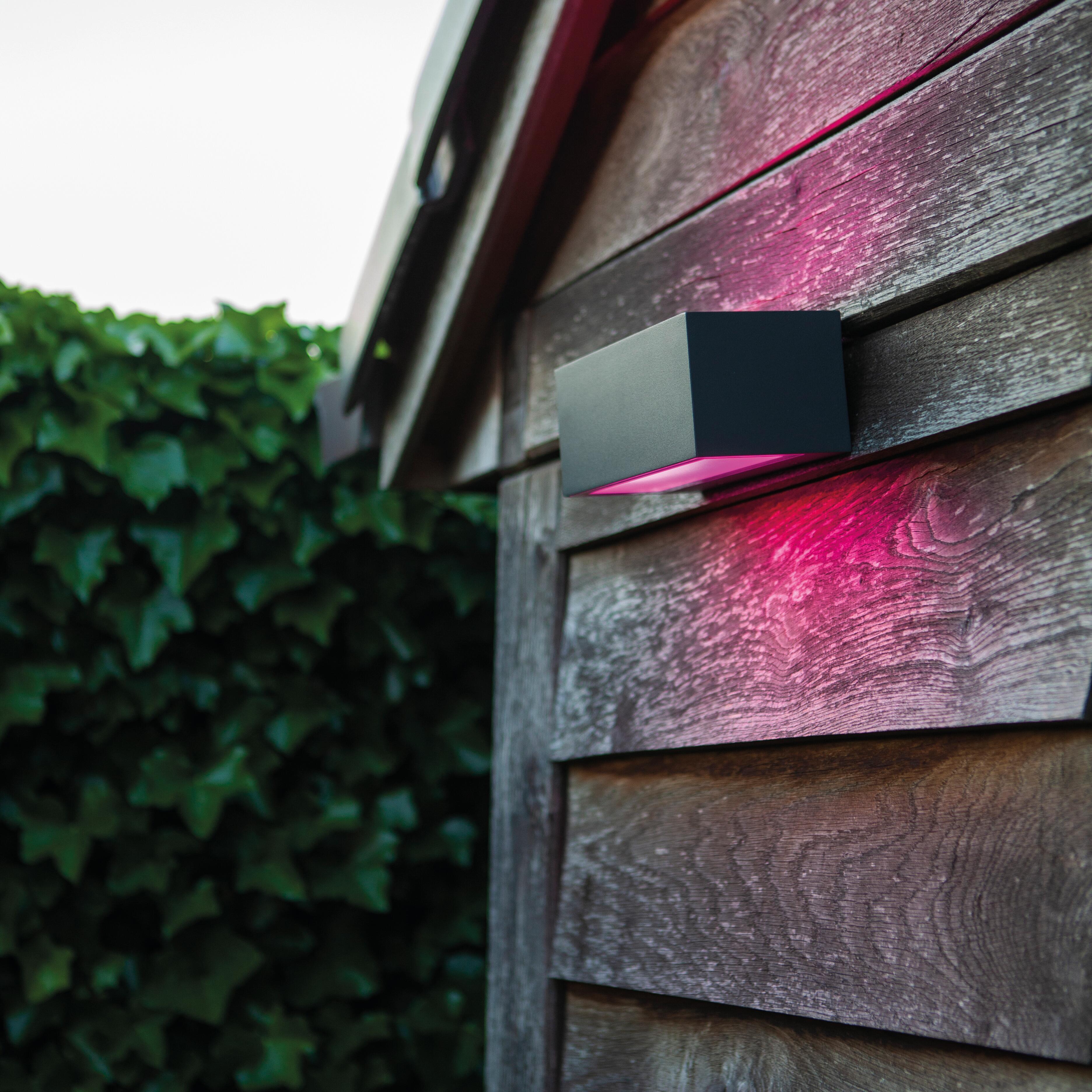 Applique minimalista in alluminio pressofuso, potenza luminosa di 800 lumen, che copre l'intera superficie in due direzioni. Questa elegante lampada in grigio scuro garantisce un fascio luminoso perfetto grazie al modulo LED connesso.. Adatta per installazione all'esterno a parete. Lampada LED connessa. Applique LED testa mobile