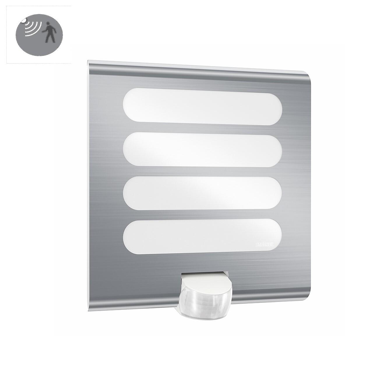 Lampada a sensore per esterni L 224 LED. Estetica moderna grazie alla schermatura in acciaio inox con feritoie orizzontali per un'illuminazione ottimale (410 Im). La lampada quadrata unisce l'innovativa tecnologia LED e l'alta precisione dei sensori a raggi infrarossi di STEINEL. Angolo di rilevamento di 180°, raggio d'azione di 10 m, consumo d'energia di 7,5 Watt.