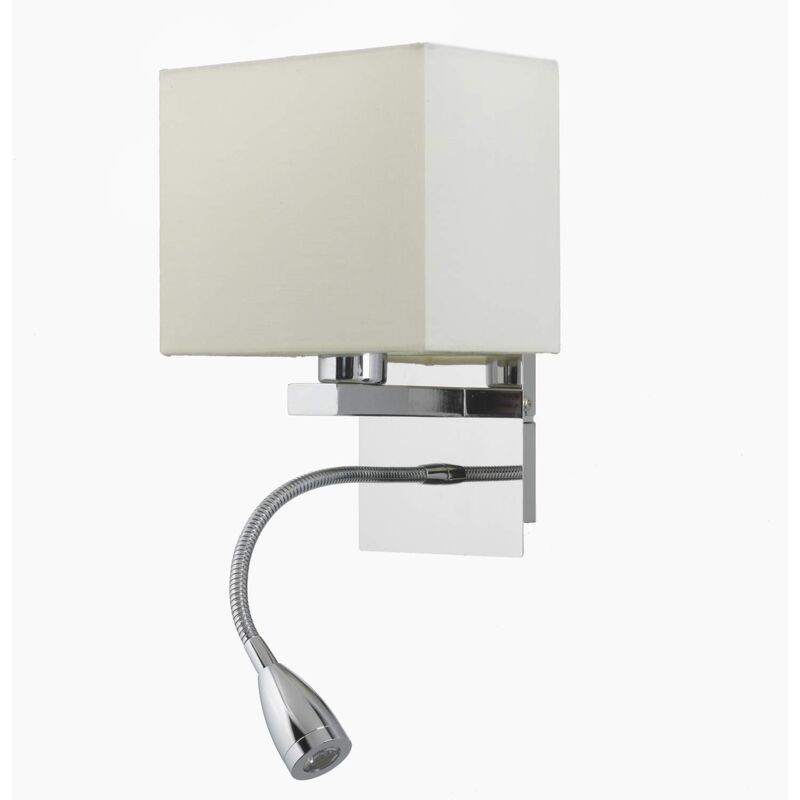 Questa Applique moderna è perfetta come lampada da lettura per la camera da letto. La struttura è in metallo cromato lucido, mentre il paralume è in tessuto di colore Avorio chiaro. Oltre alla lampadina classica (non inclusa) è presente una luce a LED (1W) con braccio flessibile il cui interruttore per accensione si trova sulla base dell'applique.