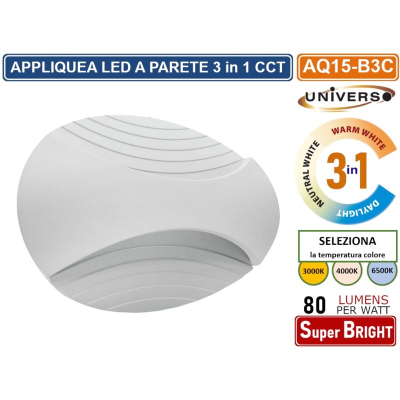 Universo AQ15-B3C è un Applique LED con potenza di 6W, predisposta per un'installazione a superficie. Con fascio luminoso di 180° e flusso luminoso di 480 lm, questo pannello ha un rapporto di 80 lm/W . Realizzato in alluminio di colore bianco, ha una copertura a finitura opaca. La particolarità di questa lampada è quella di incorporare diverse temperature colore da scegliere mediante l'interruttore/pulsante di accensione. Dispone di LED integrati da 6 Watt con tecnologia CCT 3 step questo significa che accendendo e spegnendo l'interruttore è possibile ottenere tre temperature di luce diverse: • Luce Bianca Calda (3000K) • Luce Bianca Naturale (4000K) • Luce Bianca Fredda (6500K) Per impostare la temperatura di luce desiderata una volta scelta l'interruttore va lasciato spento per 10 secondi per permettere all'applique di memorizzarla. Dimensioni Applique: 210 mm x 140 mm x 60 mm Dimensioni Base: 100 mm x 50 mm x 25 mm