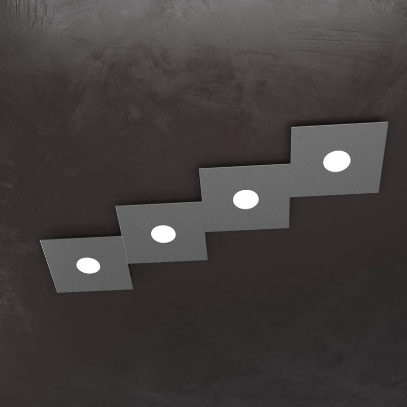 Collezione Eccentric LA LUCE ADATTABILE E FLESSIBILE Lampada 4 luci formata da quattro lastre quadrate di metallo verniciato in finitura grigio antracite.. Queste lampade sono componibili e personalizzabili, così puoi creare infinite forme e mix di colori. I componenti base sono due: uno con sorgente luminosa (1156/1L) e uno solo decorativo (1156/1D). Questi componenti possono essere assemblati fra loro per creare infinite forme e mix di colori. Per comodità vengono proposti alcuni kit precomposti con codice dedicato all' interno del sito. La presente collezione in quanto componibile è indicata per risolvere problemi di decentramento tra punto luce e zona da illuminare. Un altro punto di forza del prodotto consiste nel non utilizzare dei led integrati ma una lampadina Gx53 che, una volta montata, arriva a filo della lastra metallica e può essere facilmente sostituita dall'esterno. Scopri la Serie Eccentric e lasciati ispirare dalla sua versatilità e qualità.Questo articolo è