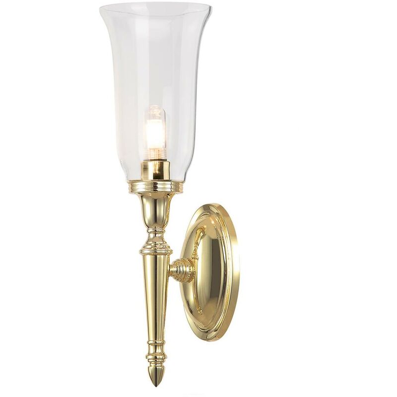Lampada a parete Dryden 1xg9 H: 41 L: 12 B: 12 IP44 3000K Dimensioni in mm: Altezza: 410, larghezza: 120, profondità: 120, Peso in kg: 1580 Tipo di agente luminato/versione: g9 Prestazioni massime in Watt: 3,5 Colore chiaro in Kelvin: 3000 Colore della luce: bianco caldo luminosità nel lume: 320 Dimmbar: No Classe di protezione: IP44 Materiale di alloggio: Fatto in ottone solido, vetro colore: ottone lucido