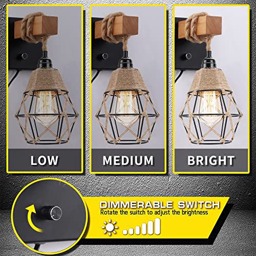 Applique da Parete Interno Vintage, Lampada da Parete Gabbia di Metallo Design Industriale, E27 Lampada a Muro Retrò in Legno con 1,8M Cavo E Spina, Per Soggiorno Camera da Letto Cucina, Nero