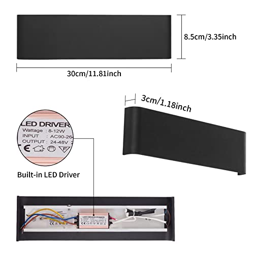 Applique da Parete Interno Nero 30cm LED Wowatt Moderno Lampada Da Parete 12W Bianco Caldo 2800K Applique Camera da Letto 220V 960LM Applique Interni Muro Corridoio Scale Soggiorno Luce Notturna Bagno
