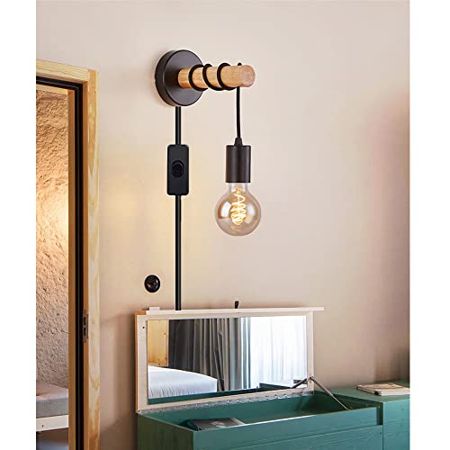 E27 Applique da parete 1.8M Cavo con Interruttore e Spina Moderno Legna Lampada a muro Metallo luce per la lettura luce notturna per Camera da letto capezzale Soggiorno Cucina Corridoio Scala (Nero)