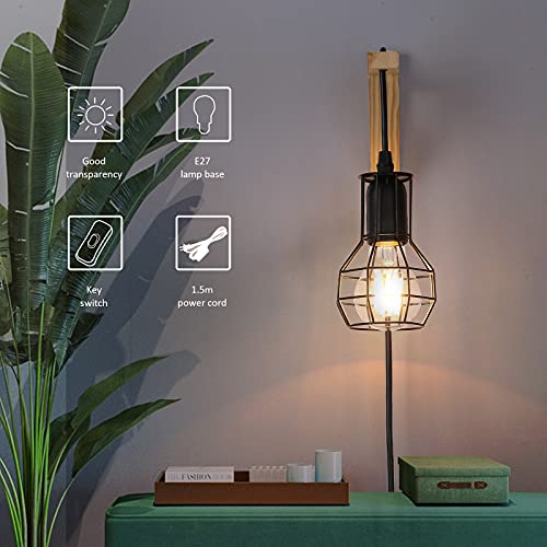 Applique da Parete Legno Nero Moderna con Gabbia Paralume - Lampada a Sospensione Led Vintage Illuminazione Regolabile - Industriale Faretto Led Interno Decorazione per Soggiorno Camera da Letto Bagno