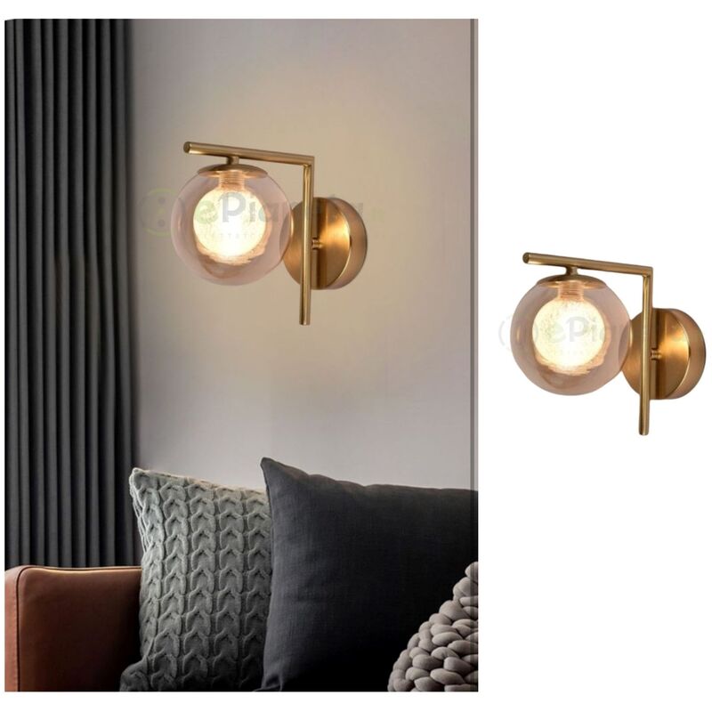 Applique da parete dal design moderno e minimal. Struttura in metallo dorato con rifinitura satinata e sfera in vetro ambrato impreziosita al suo interno da una sfera più piccola effetto cristallo, in modo da creare un illuminazione soffusa gradevole ed accogliente. Ideale per soggiorni, camere, corridoi, studi, perfetto anche per contesti pubblici come negozi e ristoranti. Caratteristiche tecniche Attacco 1 x G9 ( lampadina non inclusa) Potenza max supportata 60W Colore corpo Oro satinato Voltaggio AC220-240V Frequenza 50/60Hz Materiale Metallo+Vetro Uso Interno Dimensioni Larghezza 180 mm Altezza 210 mm Tipologia: Applique