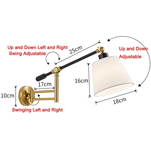 E27 Applique da parete vintage in metallo con braccio girevole regolabile con interruttore e spina, lampada da lettura a parete per camera da letto, cavo da 1,8 m, paralume in tessuto, Golden White