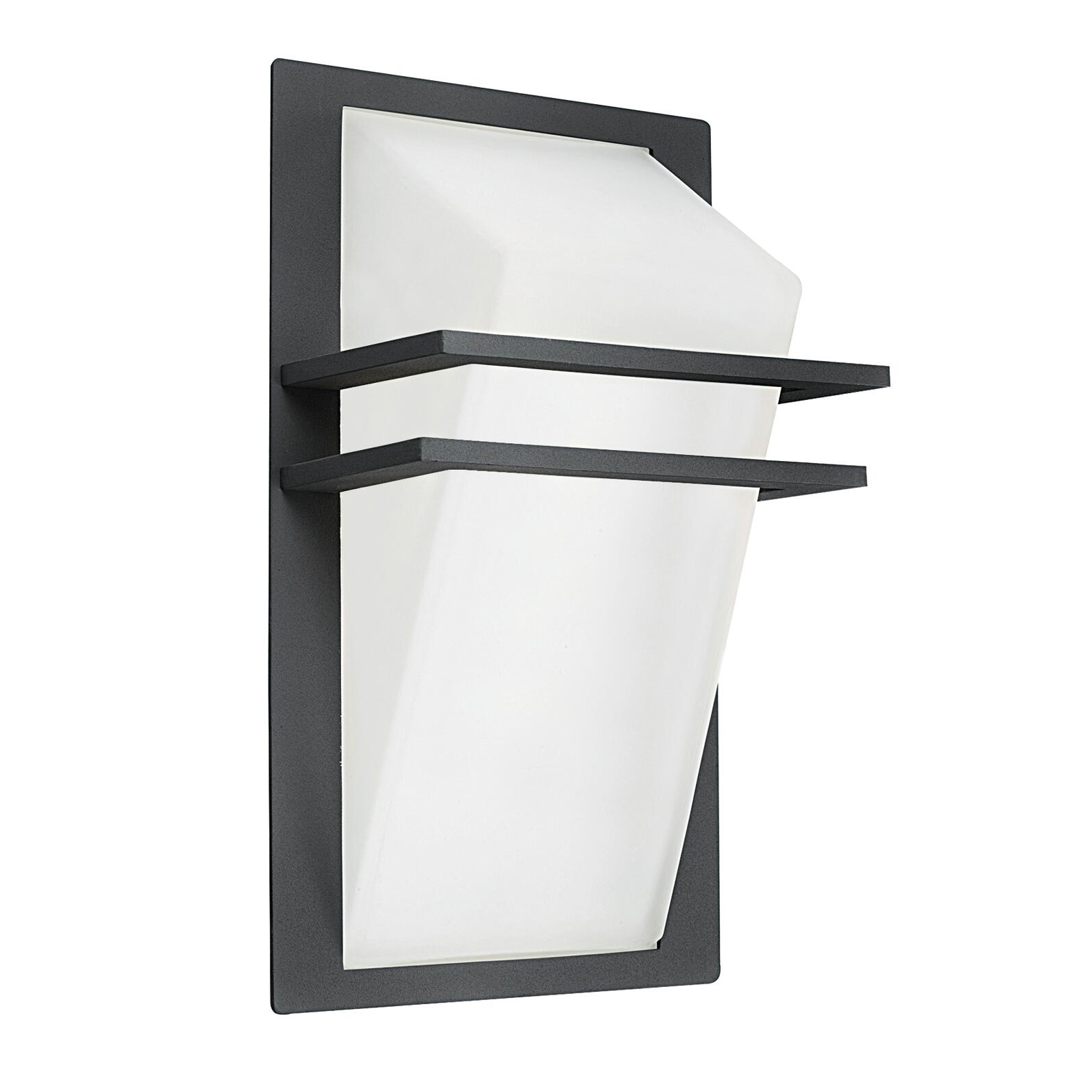 Applique da parete. 1x60W. Lampadina non inclusa, attacco E27 (grande). Struttura in alluminio verniciato antracite / diffusore vetro bianco satinato e in alluminio verniciato antracite. IP44. Dimensioni: 20 x 14,5 x H35 cm