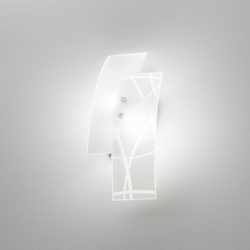Collezione Frida FORME UNICHE E TRASPARENZE CHE AFFASCINANO Applique piccola 2 E14 con montatura in metallo, finitura cromo. Vetri satinati e colorati in bianco che si intersecano. Finitura satinata. Frida affascina per le trasparenze del vetro satinato ma la sua firma unica sono gli elementi centrali decorati da segni liberi.