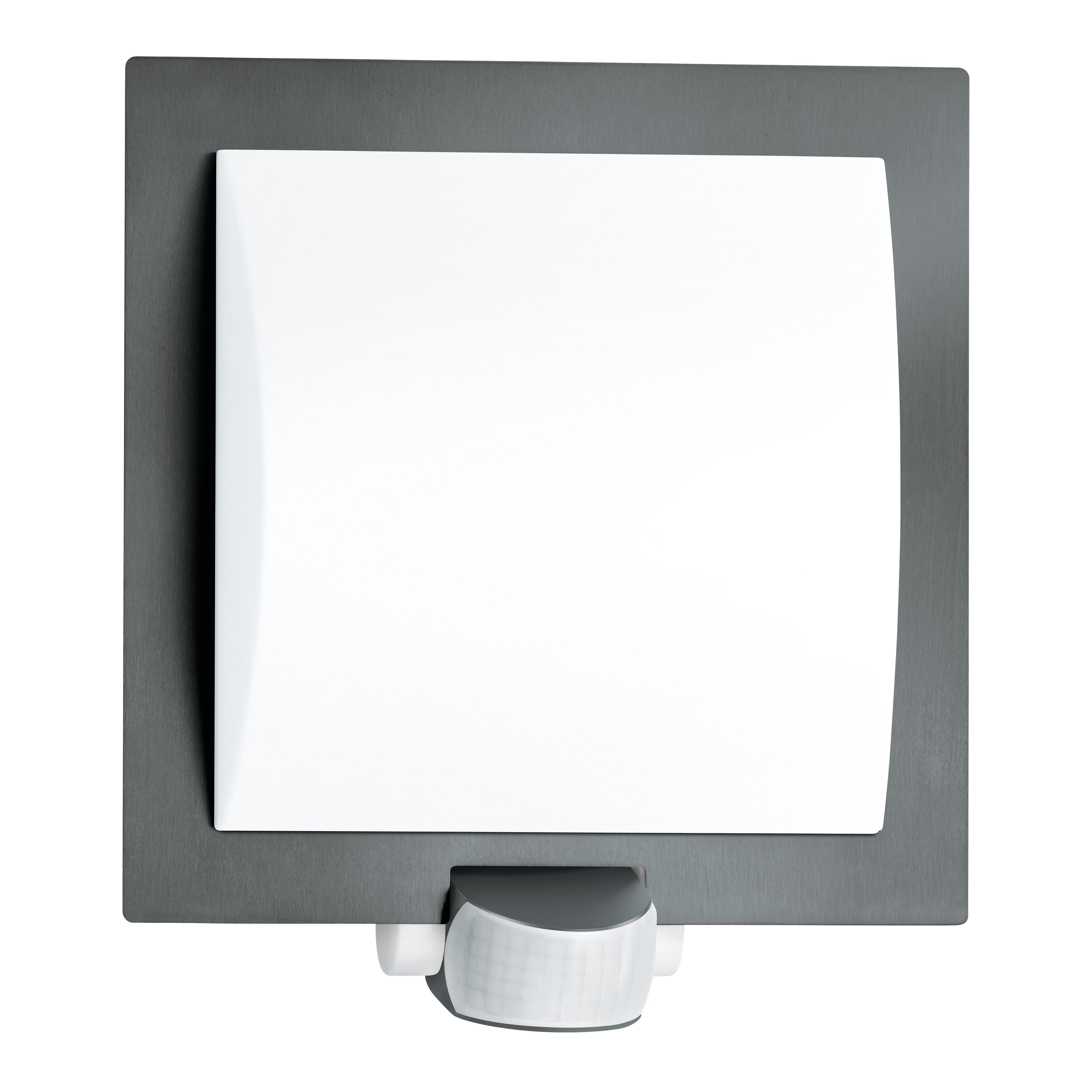 Lampada a sensore con design per esterno L 20, ideale per aree d'ingresso e facciate di case, angolo di rilevamento di 180°, raggio d'azione fino a 10 m, durata del periodo di accensione e soglia di luce crepuscolare regolabili, sensore orientabile di 90° in verticale per il preciso adattamento al campo di rilevamento, schermatura in acciaio inossidabile.