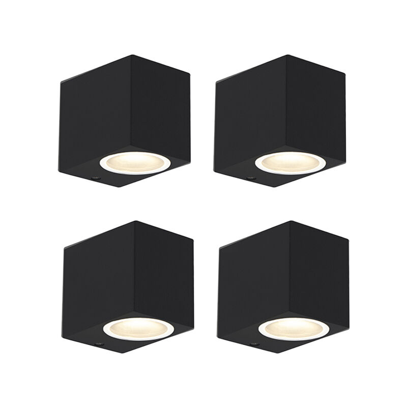 QAZQA Set di 4 applique moderne nere IP44 - BALENO I Dona un tocco moderno ai tuoi interni con l'applique Baleno II. Viene fornito in un set di 4, quindi avrai abbastanza illuminazione a un prezzo fantastico! L'applique ha una profondità di 9 cm, una lunghezza di 6,5 cm e un'altezza di 7,9 cm. Il bello di Baleno II è che la lampada fornisce luce sia verso l'alto che verso il basso. Questo crea un bellissimo effetto luminoso e suggestivo. Completa il set di 4 applique con 8 lampadine GU10 (max. 35W). Quindi non dimenticare di ordinarle separatamente. Con il suo valore IP44, l'applique è a prova di schizzi, perfetta per l'ingresso o anche per il bagno. Se vuoi creare un'atmosfera ancora più suggestiva, puoi collegare le applique a un dimmer. Questa elegante applique è un must-have per i tuoi interni moderni. Portalampada: GU10 . Max 1 x 35 W, 230 V Adatto a: Algogene, LED Voltaggio: 220V/230V IP Classe di protezione: IP44 Funzioni extra: Regolabile: Dimmer escluso,No, senza cavo e spina