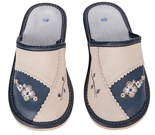 APREGGIO Pantofole da Donna Pelle Suola in Gomma Punta Chiusa Confortevole Prodotto 100% Naturale Fatto a Mano (Blu, 41)