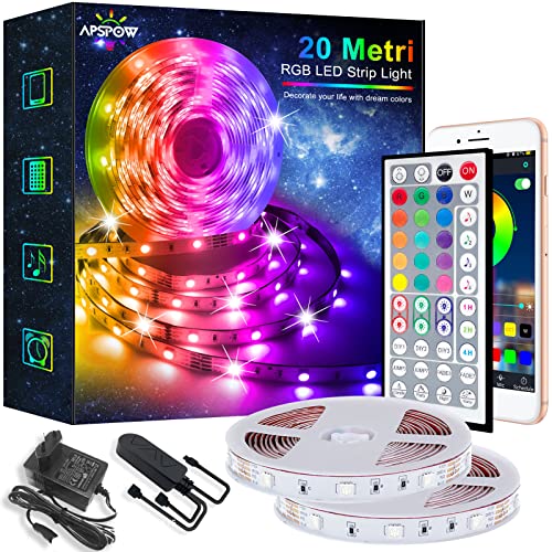 APSPOW Striscia LED RGB, lunghezza 20 metri,RGB luce di striscia led, Luce di nastro LED, Controllo App e Telecomando IR, Musica Strip Led, Luci led Colorati per Camera da Letto Decorazioni