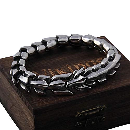 AQzxdc Braccialetto Testa di Drago Celtico in Acciaio Inossidabile Resistente, Bracciale Vichingo da Uomo con Catena A Maglia Fredda Braccialetto Nordico Vintage con Amuleto Pagano,Argento,22CM