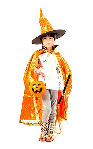 Arancione - Mantello - Cappello Strega - Streghetta - Mago - Stregone per Bambini - Costume - Travestimento - Accessori - Carnevale - Halloween - Decorato stelle oro - Idea regalo natale compleanno