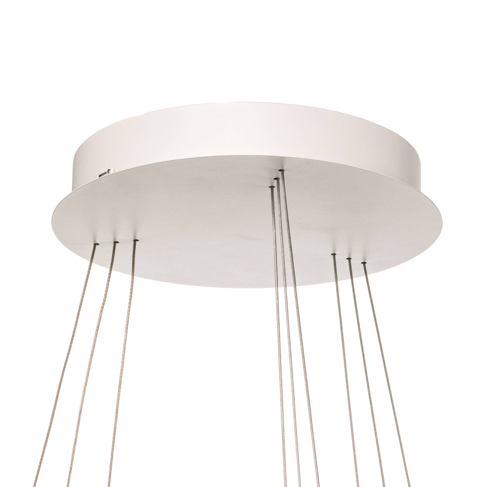 Moderno apparecchio a LED a sospensione Albiona a forma di triplo anello per l'illuminazione di zone pranzo L'apparecchio a LED a sospensione Albiona sorprende per il suo design sofisticato e i LED luminosi. Tre paralumi dalla moderna forma ad anello sono fissati in modo asimmetrico a sospensioni in filigrana, in modo da distribuire uniformemente la luce nell'ambiente. I LED luminosi sono in grado di illuminare in modo eccellente anche le zone giorno e pranzo più ampie e sono adatti anche all'uso in aree commerciali. La luminosità può essere regolata con un tradizionale dimmer di fase leading-edge o trailing-edge (dimmer non incluso). Il semplice design completamente bianco ha un aspetto minimalista ed elegante, così che questo apparecchio a sospensione può essere integrato in diversi ambienti e diventa un richiamo visivo anche quando è spento.