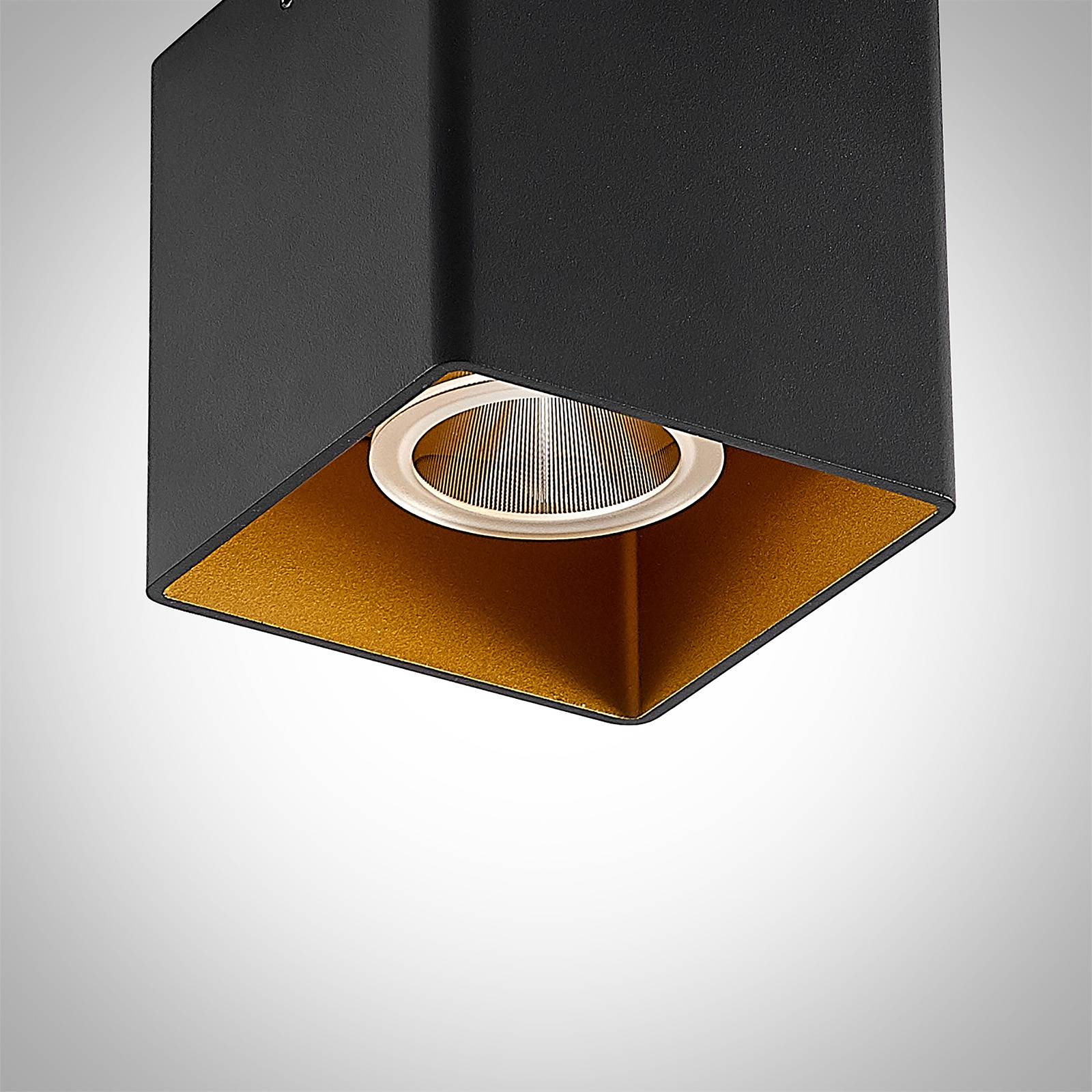 Plafoniera quadrata a LED Zaki in nero e oro Il design simmetrico e l'accattivante combinazione di colori rendono la plafoniera a LED Zaki una soluzione elegante quando si tratta di illuminare correttamente uno spazio abitativo. È in alluminio e il suo paralume a forma di cubo è verniciato di nero, mentre le pareti interne sono dipinte di colore dorato. Il paralume, che si apre verso il basso, circonda il LED installato in modo permanente e la luce generata, in modo da rendere possibile l'illuminazione senza abbagliamento di un soggiorno o di una sala da pranzo. La plafoniera a LED Zaki è una buona scelta anche quando è richiesta un'illuminazione salvaspazio. Grazie alle sue dimensioni compatte, trova un posto adatto in qualsiasi stanza, non importa quanto piccola, e fornisce una luce sufficiente in essa.