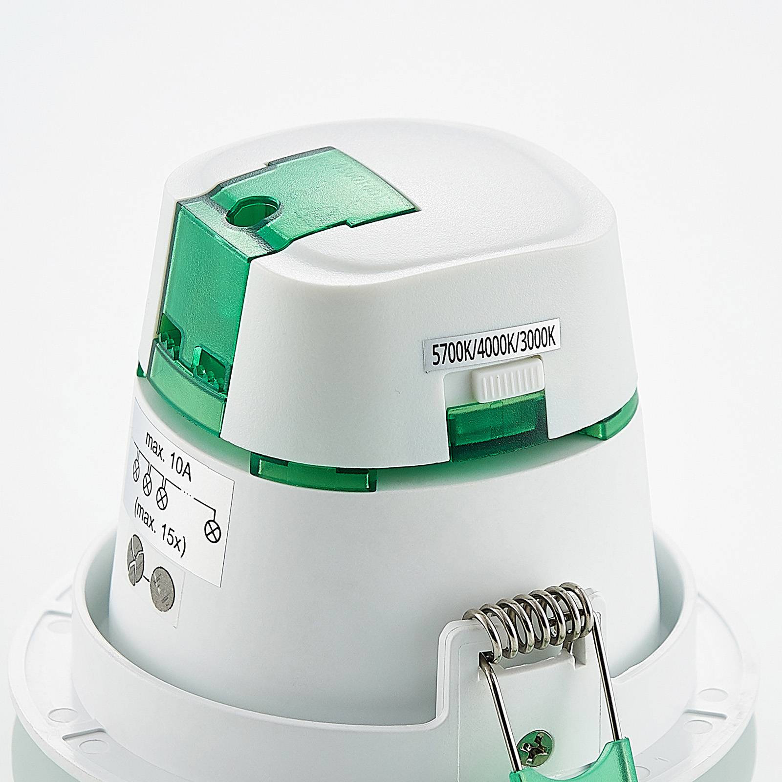 Faretto da incasso girevole e dimmerabile a LED Katerin con cornice bianca e forma rotonda, colore della luce regolabile Katerin è un faretto da incasso a LED molto utile che può brillare in tre colori di luce. Prima del montaggio e dell'incasso nel soffitto, si deve prendere una decisione e si può scegliere tra uno dei tre colori di luce, che possono poi essere controllati tramite un interruttore DIP sul corpo. Al centro dell'alloggiamento dell'apparecchio bianco si trova il corpo dell'apparecchio orientabile, che può essere inclinato fino a 25° in modo da poter determinare meglio l'emissione luminosa. La luce fuoriesce con un angolo piuttosto stretto di 36° in modo da produrre una luce prevalentemente puntuale e da poter illuminare in modo specifico singoli oggetti o aree. Con la protezione IP44, l'apparecchio può essere utilizzato senza problemi anche nei bagni e in altre stanze umide, perché è adeguatamente protetto da sporco e umidità. L'uso dell'apparecchio non è limitato ai salotti;