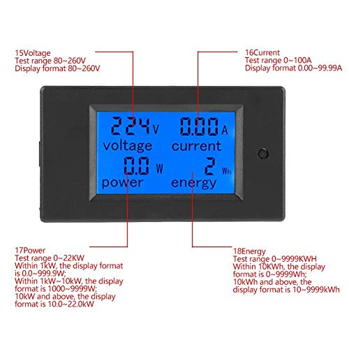 【Display digitale di grandi dimensioni】 Il nostro tester di energia in corrente di tensione con display digitale LCD retroilluminato blu mostra chiaramente tutti i numeri di test. Il display LCD a grande schermo può visualizzare simultaneamente i parametri di tensione, corrente, potenza ed energia.