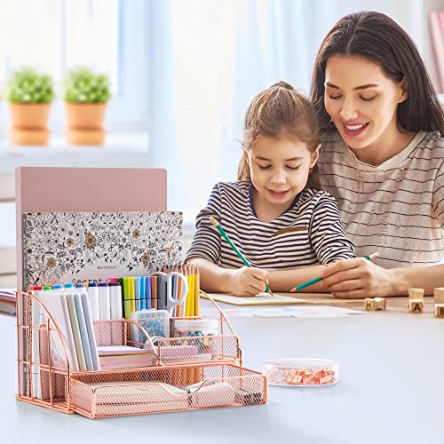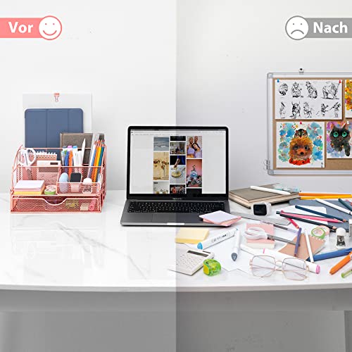 Unico ed elegante: L'organizer da scrivania in rete è realizzato in metallo di alta qualità con un rivestimento durevole antiruggine. La combinazione di rete metallica e oro rosa, con bordi in metallo rinforzati e aspetto elegante, rende la vostra scrivania una vera attrazione Se vuoi aggiungere un tocco elegante e femminile al tuo posto di lavoro, il prodotto in oro rosa è quello che fa per te.
