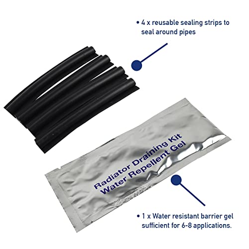 Facile da usare: posizionare il vassoio di scarico sotto il radiatore, montare la dimensione corretta deviando il collare al tubo. Sigillare il collare con il gel barriera dell'acqua e, una volta posizionato correttamente e fissato intorno al tubo, procedere lentamente per allentare la valvola di unione del radiatore per rilasciare l'acqua.