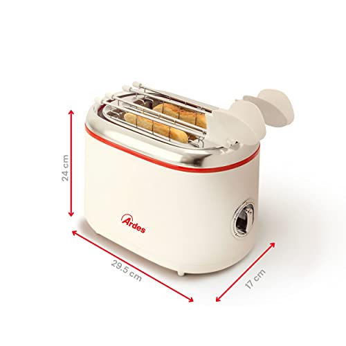 PESO, DIMENSIONI ED ESTETICA | Il tostapane Ardes è piccolo e poco ingombrante. Pesa 1,5 kg e ha le seguenti dimensioni: lunghezza 29.5cm, profondità 17cm e altezza 24cm. Oltre alla comodità, il tosta pane può vantare un'estetica vintage che darà alla tua cucina un tocco di classe.