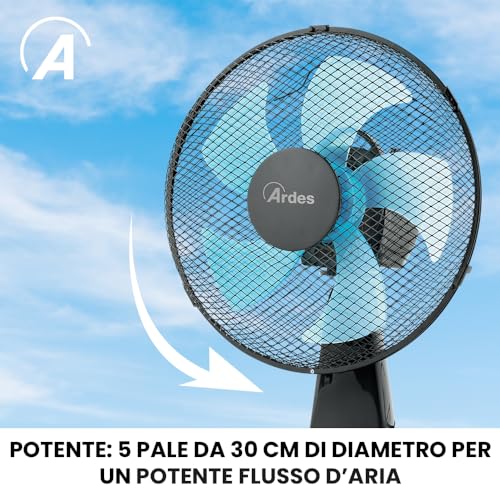 Ardes - AR5ST30N Ventilatore da Tavolo STEELO 30N 5 Pale - Ventilatore da tavolo 30 cm Oscillante con Inclinazione Regolabile - Ventilatore 3 Velocità Silenzioso