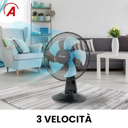 CARATTERISTICHE - 3 velocità di rotazione, oscillazione automatica e inclinazione regolabile rendono il ventilatore da tavolo Ardes il tuo piccolo e silenzioso alleato contro il caldo estivo. Larghezza 35 cm, profondità 26 cm e altezza 47 cm