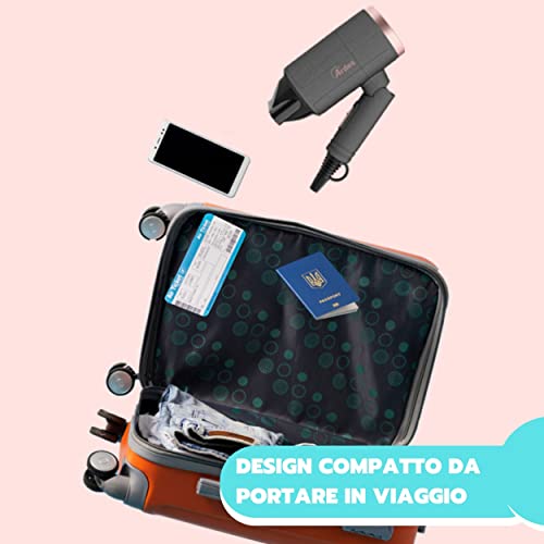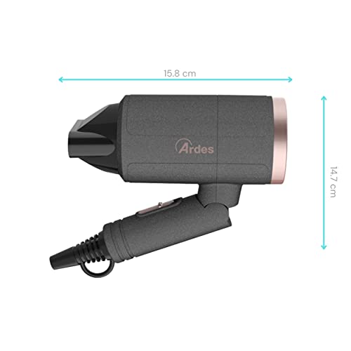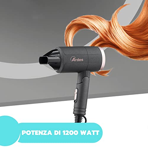 ARDES | ARPHON01 Phon Per Capelli STYLITO 1200W, Asciugacapelli Professionale Compatto Viaggio Manico Pieghevole, Phon Da Viaggio Pieghevole con Concentratore, Gancio e Cavo Lungo, Phon Nero-Ororosa