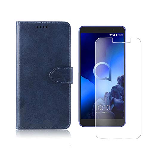 ARDOUR VAN WenJie Para Alcatel 1S 2019(5.5") Vidrio Templado + Funda para Estuche de Cuero Moda con Ranura para Tarjeta de crédito de identificación, Funda para teléfono con Billetera anticaída-Azul